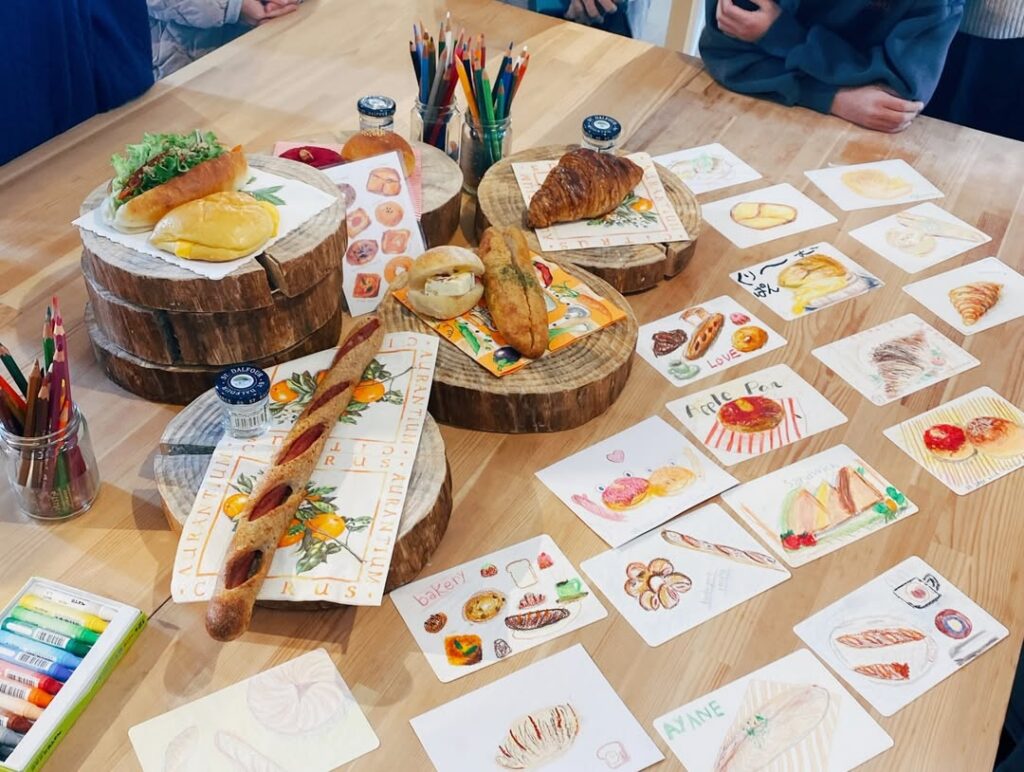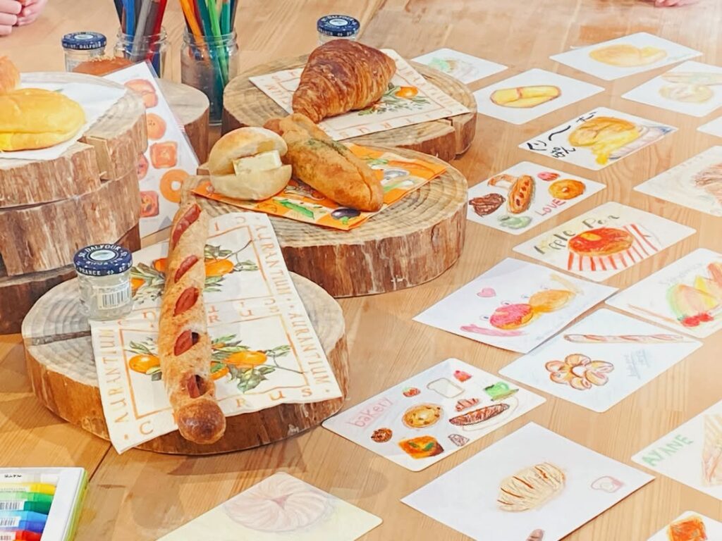 レコルトのパンを見ながら、みんなでパンのイラストを描くワークショップ。